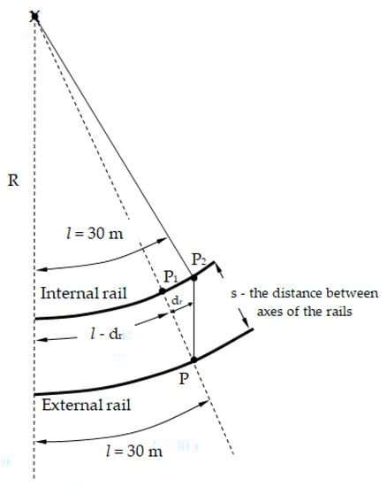 Corresponding themselves sections of the external and internal rail, contained between the same radii, have different lengths. The internal rail is shorter (Figure 6). In order to carry out measurements of rail shortening with the MMS device, the matching themselves sections of external and internal rails were divided into lengths l = 30 m. In the next stage, a projection of the obtained end point P on the inner rail was carried out, obtaining a point P1. The difference between the with projection point P1 on the inner rail and the end point P2 is the value of the real dr rail shortening (Figure 6).