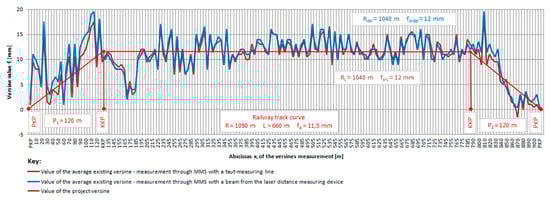 Three points on a plane determine a circle with a radius R, and the height of this triangle is the curve versine fi, while the base is the measurement chord ci. The shapes of track sections such as transition curves and curves are analyzed and evaluated on the basis of horizontal versine measurements. Adjustment of the track location in the horizontal plane by thrusting the track on curves and transitional curves should be verified through the measurement of versines. In reference to the topic of measuring the actual condition of a railway track curve, authors of numerous publications [,,] have drawn attention to the fact that in order to minimize errors, land surveyors are obliged to take accurate measurements and properly select and calibrate measurement instruments depending on the purpose of the measurement []. Within the scope of preparatory works, the correct location of the track axis must be determined at the level of the track axis adjustment marks while thrusting the track. It has also been found out that if there are no adjustment marks near the track, then the displacement values are determined by using the values of versines measured every 5 m on a chord of 10 m []. Additionally, when the track is thrusted in its proper position, besides verifying the distance between track centers on multitrack railway lines, the preservation of the clearance gauge for structures and trolley poles, and the tilt, the values of versines on the transitional curve and the curve must also be ensured []. Transitional curves and railway track curves have different lengths in parallel matching, and the difference depends on the length and radius []. The value of the track radius (curvature) is determined by measuring the value of the versines. The state of the track curvature is assessed by dividing the curve into measuring sections of 5 m []. There are essentially, found that there are two methods for monitoring tracks. The first one assumes that the track is examined with optical instruments. This method is employed to analyze the geometrical quality of the track, and it is required for the designing processes related to comprehensive track works. In the second method, the railway track is examined from the chord to the running edge of the rail. The measured values are called versines, and measurements are carried out cyclically with overlapping strings. Attention has been drawn to the stringlining or the Hallade method []. The Hallade method was also referenced in [,,,,]. Because curvilinear sections of the track are more prone to geometric irregularities than straight sections, they require regular maintenance and repair works []. The maintenance of the railway surface is its diagnostics together with the implementation of conclusions resulting from it, as well as planning and execution of maintenance and repair works []. A new system for correcting track irregularities has been developed using high-performance track machines (tamping machines). In this method, optimal data are calculated on the basis of measurements of track abnormalities using a three-point system [,]. The chord method is generally used for the horizontal and vertical versine measurements of rails in order to maintain their alignment []. In [], the horizontal versines of the left and right rails were precisely calculated, and the vertical versine functions were exactly derived. According to these inferences, line charts for determining the vertical versine were created to demonstrate the proportional relationship with the grade difference and the curve length.