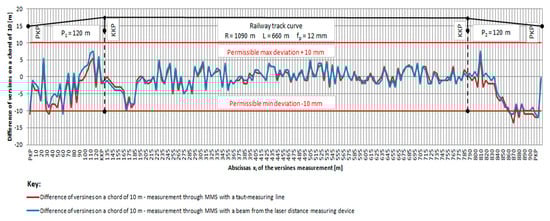 The measurement of versine in curves is performed on the basis of 10 m chord, such recommendation results from both the Id-14 (D-75) [] instruction and the Id-1 (D-1) [] technical conditions. Additionally, Id-14 (D-75) [] and Id-1 (D-1) [] define the values of permissible basic deviations as the differences of versine on the chord measured 10 [m] (measuring base). The tests of track No.1 using MMS and Versine Measuring Device were carried out according to the requirements of these regulations. The distance between measured points is 5 m. According to the recommendations of Id-14 (D-75) [] and Id-1 (D-1) [] regardless of the value of the curve radius, the length of the chord is always 10 m and the distance between the measured points is 5 m.