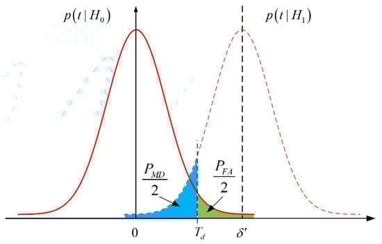 For a given probability of false alert , the threshold can be given by the quantile of standard normal distribution function, i.e., , which means that the decision is made at the risk of . As shown in Figure 1, the test threshold controls the probabilities of false alert and miss detection, and there is a tradeoff between them. An increase in the threshold implies a lower false alarm rate and higher miss detection rate, and vice versa. Generally, the required probability of false alert is chosen by rule of thumb. In this paper, the value of is set as 0.001.