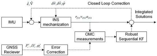 Figure 2 shows the block diagram of the proposed tightly-coupled GNSS/INS integration algorithm. In the figure, the solid and dash arrows are the INS-related high-rate and GNSS-related low-rate information flows, respectively. INS mechanization calculates the high-rate navigation result (position, velocity, and attitude) with the compensated raw INS data. In parallel, the GNSS receiver provides low-rate pseudorange, Doppler, carrier phase, and ephemeris data. Then systematic error sources are corrected using combination and difference techniques, along with some empirical models. The corrected GNSS observations and the INS-predicted counterparts form the OMC measurements. The robust sequential KF uses the OMC measurements to estimate the error states, which are fed back into the INS to correct the navigation solution as well as the INS sensor biases.
