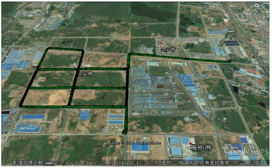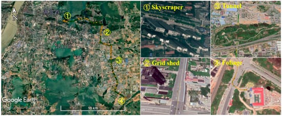 The second test was performed in a city urban environment in Wuhan, China, on 11 September 2018, as shown in Figure 11. The trajectory was generated using RTKLIB program package (http://www.rtklib.com), where green and yellow dots stand for fixed and float solutions, respectively. The vehicle drove four typical GNSS changeling environments successively, including