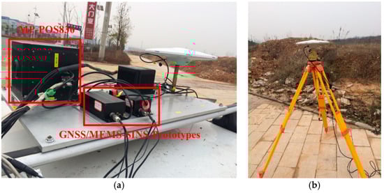 The test was performed in March 2015 in a suburb of Wuhan, China, as shown in Figure 3. Two sets of navigation systems were mounted on the roof of the test vehicle. The first is a prototype GNSS/INS system which integrates low-cost STIM300 MEMS with Novatel OEMV-3 receiver. The raw data from the prototype system was processed and analyzed with the proposed algorithm. The sampling rates were set 125 Hz and 1 Hz for MEMS and GNSS receiver, respectively. The second is a reference system (POS830, manufactured by Wuhan MP Space Time Technology Company, Wuhan, China). A temporary base station was set up nearby whose coordinate was determined through PPP processing of 2-h static GPS/GLONASS/BDS data. The resultant solutions act as the reference to evaluate the performance of the proposed algorithm when applied to MEMS-based INS. Figure 4 shows the test setup. Table 1 and Table 2 list the performance parameters of the two systems.