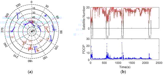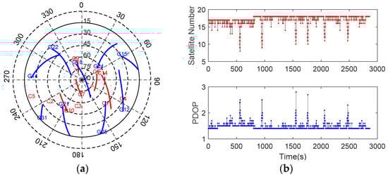 The GNSS receiver was set to track GPS (L1 and L2) and BDS (B1, B2, and B3) dual-constellation five-frequency signals. Figure 5 shows the sky plot and the satellite visibility in terms of satellite number and positional dilution of precision (PDOP) (15° elevation mask). It can be observed that the geometry is favorable, and the average number of visible satellites and PDOP are 17.26 and 1.46, respectively. This indicates that multi-GNSS combinations can raise the number of available satellites and strength the station-satellite geometry significantly.