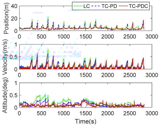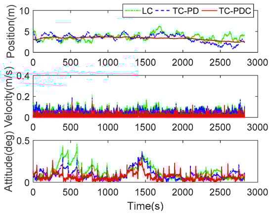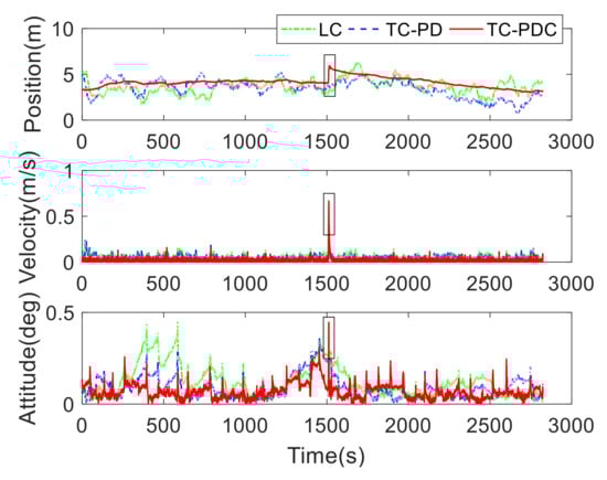 Figure 6 plots the position, velocity and attitude errors of the three integration schemes. Table 3 summarizes the corresponding root-mean-square errors (RMSE). Compared with LC, the RMSE values of TC-PD decrease from 3.7490 m, 0.0601 m/s, and 0.1463 deg to 3.5867 m, 0.0538 m/s, and 0.1086 deg with improvements of 4.33%, 10.48%, and 25.77% in the position, velocity, and attitude. As expected, TC outperforms LC. For TC-PDC, the RMSE values of velocity and attitude further decrease to 0.0272 m/s and 0.0795 deg, with significant improvements of 54.74% and 45.66%. However, the position accuracy becomes a bit worse with a degradation of 10.93%. From Figure 6, the position errors of TC-PDC abruptly jumps around 1555 s (marked with a black rectangle), making the succeeding position errors increase. The velocity and attitude are also observed gross errors around the same time instant. This abnormal errors could be caused by the cycle slip of carrier phase, as they are absent for LC and TC-PD. These outlying navigation results will cause unacceptable degradations in the control performance, especially for some high-speed safety-related applications, thus have to be carefully addressed.