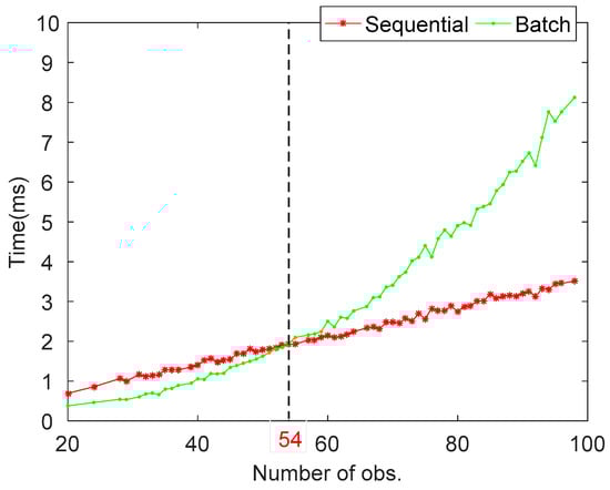 Figure 10 plots the mean computation times with the increase of number of observations in TC-PD and TC-PDC for sequential and batch processing. As the number of observations increases, the computation times of batch and sequential modes increase in polynomial and linear ways, respectively. When the number of observations are more than about 54, the sequential mode is faster than batch mode and this superiority is more significant for a large number of observations. The main reason behind is that the computational cost of matrix inversion in batch mode proportional to the third order of dimension. From Equation (20), it is easy to conclude that the computation times of measurement update in sequential mode proportional to the number of observations to be processed. Therefore, it is suggested that for multi-constellation multi-frequency GNSS/INS tightly coupled integration, sequential measurement update should be adopted to improve the computational efficiency.
