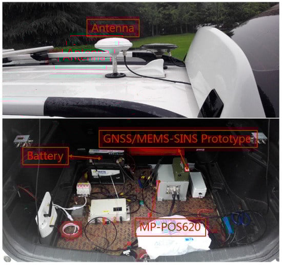 The test equipment is shown in Figure 12. The GNSS/MEMS-SINS Prototype consists of STIM 300 MEMS and ComNav K708 receiver. The sampling rates of INS measurements and GNSS observations were 125 Hz and 10 Hz, respectively. The collected data was processed and analyzed in the sequel. POS620 from Wuhan MP Space Time Technology Company was used for generating the reference. The corresponding main performance parameters of POS620 are shown in Table 7.