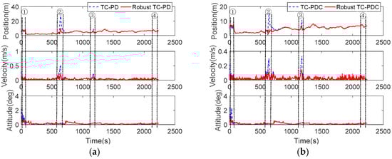 Performance of the proposed method in challenging environments. (a) TC-PD and robust TC-PD; (b) TC-PDC and robust TC-PDC.
