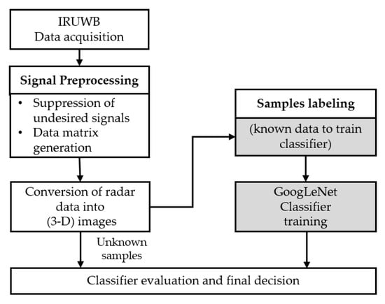 The rest of the manuscript is structured as follows: Section 2 deals with the theoretical background, including data acquisition, signal preprocessing, and details on the implemented deep-learning classifier; Section 3 presents an experimental setup based on two radars to validate the theoretical framework presented in Section 2; finally, the experimental results and conclusions are presented in Section 4 and Section 5, respectively.