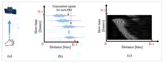 Conversion of the gesture signal to a grayscale pattern. (a) Experimental setup showing a hand moving towards the radar; (b) respective symbolic representation of individual fast-time signals; (c) generated grayscale image.