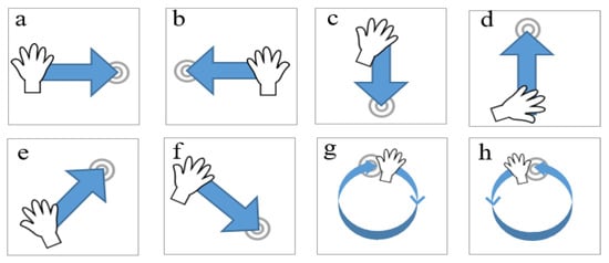 The above formulated hardware setup was utilized to acquire data against the gestures shown in Figure 11. Eight gestures were carefully selected for a performance evaluation of the hand gesture recognition framework. Figure 11a–h represents the respective left-right swipe (LR-swipe), right-left swipe (RL-swipe), up-down swipe (UD-swipe), down-up swipe (DU-swipe), upward diagonal swipe from left to right (diag-LR-UD-swipe), downward diagonal swipe from left to right (diag-LR-DU swipe), clockwise rotation (CW-rotation), and counterclockwise rotation (CCW rotation). Moreover, we used three different human subjects to gather training data to avoid biasness in training and testing samples. In total, 100 samples were collected for each gesture, and 80% of the data were used for training purposes, whereas 20% were used for evaluating the trained classifier.