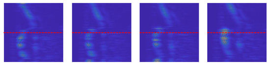 Next, the output of all the radars was concatenated together to form a single concatenated image. For the gesture vocabulary presented in Figure 11a–h, the corresponding image patterns are shown in Figure 14a–h. The red highlighted line in Figure 14 marks the boundary between the signals of each radar: The part of the image above the red line corresponds to radar-2, whereas the part of the image below the red line is the pattern against radar 1. In terms of slow-time frames, for images corresponding to every individual sample of performed gestures, the slow-time frames ranging from 1 to 112 present the signal acquired by radar-1, and the slow-time frames ranging from 113 to 224 present the signal acquired by radar-2. Since the output images of both radars are concatenated vertically, the overall size of individual images presented in Figure 14 is 224 × 224 pixels. The width and the height of images are controlled directly by adjusting the fast-time and slow-time values, respectively. A complete gesture motion should be recorded within the designated image frame to avoid errors.