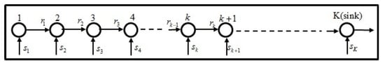 The resultant information is then quantized and transmitted to the nearest neighbor in downstream. The information fusion process continues, until the sink node receives the information. We assume that nodes are placed in equal distances. Consider the kth node in the chain, it has only one child and that child node is represented by . The linearly scaled received information from the child node is denoted by , which is given using Equation (23),