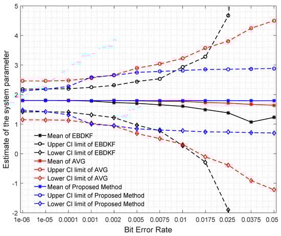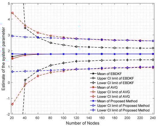 As only one parameter is estimated in our context, the coefficient matrices H, G, and F in Equations (31) and (32) reduce to one dimension. Even though the process noise (Q) is set to 4 in [], we select the state noise () as zero which will result zero process noise variance (). This is because the addition of a process noise even worsens the BER performance of EBDKF for update equations in []. In particular, we chose the best-case performance wise scenario for EBDKF to compare with the proposed method which exists when there is no process noise. Then, it will be crystal clear that if a data fusion method outperforms the accuracy of EBDKF under its best performance scenario, then the considered fusion method will outperform EBDKF under any other scenario. Therefore, the value of G is not relevant for zero process noise scenario as it can be observed from Equation (31); but we set it to zero. We set because observations are not scaled by a factor according to the way that we have modeled sensor observations for proposed method and Average as it was shown in Equation (1). In order to have a fair comparison with AVG and proposed method, the sensor observations of EBDKF are modeled in the same manner. That is the true parameter added with Gaussian noise. Therefore, for the state-space model. The sensor measurement noise variances () are generated as given in Equation (30). is modeled as a continuous uniform random variable in range [−10:10], , where is the degree of the kth node. We first evaluate the accuracy of estimating a slowly varying(deterministic) parameter for the considered time interval and then later consider the accuracy of a dynamic parameter using the three different fusion algorithms.