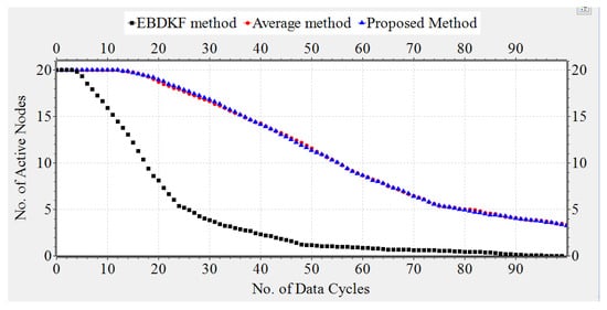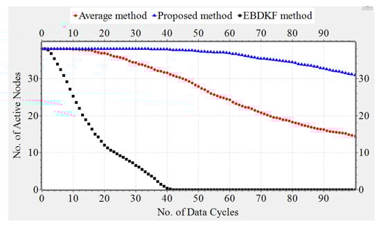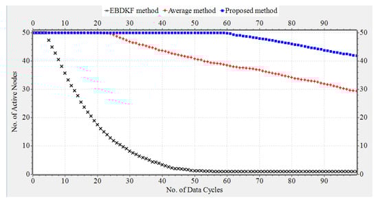 On the other hand, in EBDKF, the first node is died after four data gathering cycles. Further, we can observe that by 97 data gathering cycles, networks employing Average fusion and proposed method had lost of nodes and EBDKF has lost all of its nodes. When observing Table 6 it is very clear that highest computational consumption for fusion belongs to EBDKF method and are the reasons for having least network lifetime out of fusion techniques. Therefore, the simulation results agree with the theoretical predictions that we made earlier.