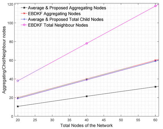 The propagation delay of a link (), frame/packet transmission/reception delay of a link (), average waiting time in queue per link for one way (), fusion time (), Maximum Link length out of links connected to neighbor nodes (), data rate (R), frame/packet size (P), number of Hops (N) of the longest path of the network and Average number of retransmission attempts (K), and career propagation speed (c) are the main determinants of Network Latency of WSNs. Using these parameters, the network latency () for a hierarchical network employing proposed method and AVG can be given as shown in Equation (20).