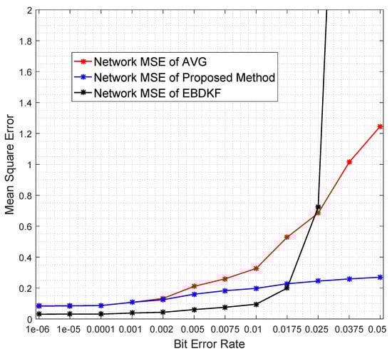 We plot the network MSE versus the communication errors for AVG, proposed method and EBDKF for the previously discussed unstructured sensor network as shown in Figure 20.