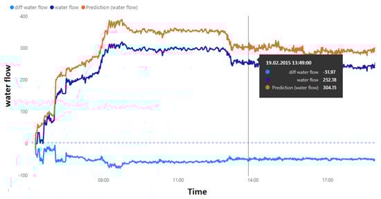 22]. Our model was trained with historical data from the period preceding the examined time. We assumed that in the time preceding the registered fault, the difference between these values would increase. A sample graph of the estimated and real values of water flow behind the pump is shown in