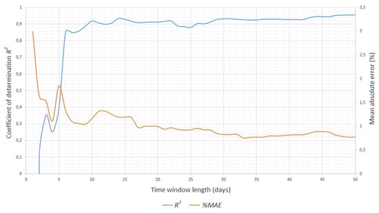 In order to ensure the satisfactory quality of the model and to evaluate it, a number of experiments were carried out to select appropriate parameters such as a polynomial degree or time window length. The experiments were carried out on the same test set, and the measures of model accuracy were the coefficient of determination and the average percentage value of Mean Absolute Error ().