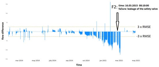 Figure 7, we observed a gradual decrease in pump performance due to leakage of the relief valve. The relief valve is used to protect the pump against seizure during start-up and low speed operation. The fault was recorded on 16 March 2015. By determining the alert threshold as three standard deviations (