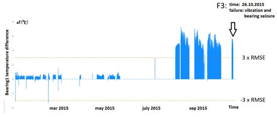 The second example (Failure F3) showed a sudden increase in the deviation of the temperature of the bearing. The anomaly occurred after a period of equipment downtime. The reasons for the failure were the lack of concentricity of the gear and motor shafts and the melting of the bearing alloy. The visible consequences of the failure were vibration and smoke from the bearing. Differences in the temperature leading to this failure are shown in