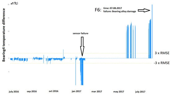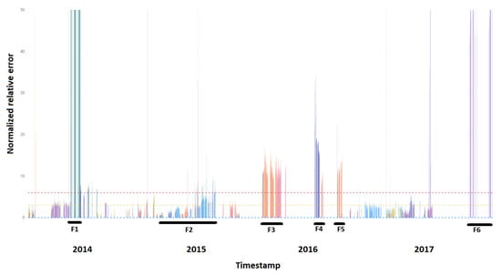 Figure 10. With F1–F6, we mark the detected (predicted) failures of equipment that really occurred in the monitoring period. Two vertical lines represent the first and the second alert level, as described in Formulas (