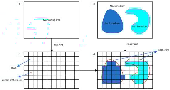 Schematic diagram of the establishment of a 2D arbitrary velocity model: (a) mornitoring area, (b) the monitoring area after meshing, (c) the geometry of a geological model with three media in the monitoring area, and (d) the figure after assigning a velocity to each block using the geometry of the geological model as a constraint.