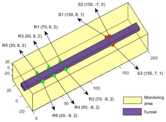 As shown in Figure 2, the microseismic monitoring area range was a cube, along x coordinates from 0 m to 200 m, y coordinates from −30 m to 30 m, and z coordinates from −30 m to 30 m. A rectangular section of the tunnel, perpendicular to the x direction, was 5 m × 5 m. A total of six receivers were arranged on both sides of the tunnel, which are represented by the green triangles and denoted as R1, R2,..., R6. The three designed seismic sources, represented using red circles, are denoted S1, S2, and S3. The specific parameters of the receivers and seismic sources are shown in Table 1. The wave velocity in the monitoring area was 5000 m/s. However, since the medium in the tunnel after excavation was air, and the energy of the waves in air is greatly attenuated, the propagation velocity in the air was much lower than the propagation velocity in the rock. Therefore, the velocity of the empty area after the tunnel excavation was set to 340 m/s.