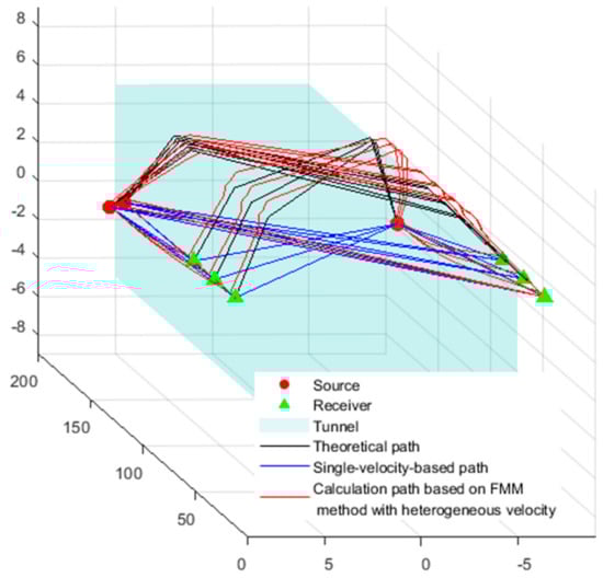 Step 2: According to the geological conditions in the monitoring area, a geometric model is established. In the absence of a large amount of geological data, it is difficult to obtain a complex and accurate velocity model that is consistent with the actual project []. Therefore, we only consider the influence of the empty area in the tunnel after excavation on the velocity model. However, the proposed method can also be applied with a complex velocity model. The wave velocity varies among different media. In a tunnel, the empty area after excavation and the unexcavated rock mass are two distinct media. The propagation velocity of P-waves in a rock mass is generally 5500–7000 m/s. However, the propagation velocity of P-waves in air is approximately 340 m/s. In this paper, these two media are considered, and an HVM for the tunnel is established to improve the MEL accuracy.