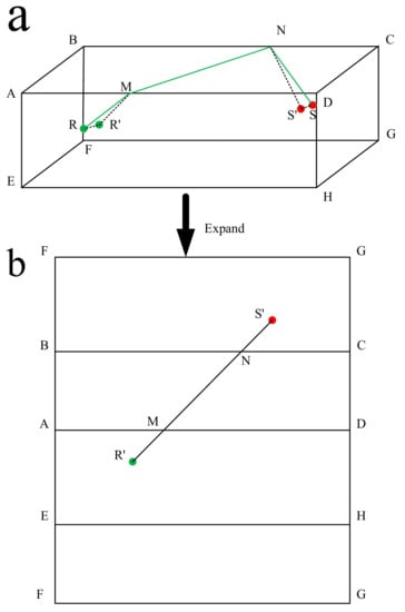 The specific calculation method of the theoretical path is as follows. Figure 4a is the tunnel model. The faces ADHE and BFGC are the two sides of the tunnel. R is the receiver that is very close to the face ADHE, and S is the source near the face BFGC. R′ and S′ are the vertical projections of R and S on the faces ADHE and BFGC, respectively. We first find the shortest distance from R′ to S′. We expand the tunnel model vertically to obtain Figure 4b. According to the principle that the line segment between two points is the shortest, we obtain the shortest path from S′ to R′, which intersects the line segments AD and BC at points M and N. We then utilize plane DNMR to obtain the shortest path from S to R (green line in Figure 4a). According to the theoretical path, the theoretical arrival time of each source to each receiver can be calculated, as shown in Table 2.