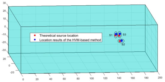 Due to the influence of noise in the tunnel, there was a certain error in the arrival picking in actual projects. To further test the practicality of the HVM-based method, we added a certain noise in the theoretical arrival time (see Table 2). We designed three contrasting experiments. First, the theoretical arrival time was used as the location input parameter, and an SVM was adopted to locate the three sources, which was expressed using the SVM. Second, the noisy arrival time was used as the location input parameter, and an HVM was adopted to locate the three sources, which was represented using the HVM(N), where N is stand for noisy arrival time. Third, the noisy arrival time is used as the location input parameter, and an SVM was adopted to locate the three sources, which is represented using the SVM(N). The location results of the three experiments are shown in Table 4, which clearly shows that the origin time obtained by these three experiments was very close to the theoretical origin time. However, the location results of the SVM and SVM(N) were significantly different from those of the HVM(N) in the Y direction.