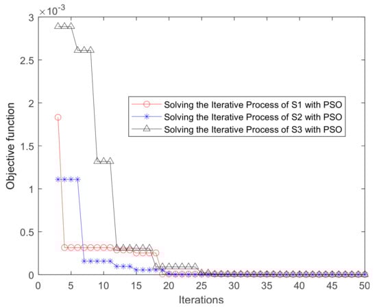 AL was then performed in the target block according to Equations (6)–(9). The minimum value of Equation (9) was found using PSO, and the AL results are shown in Table 3. Figure 5 shows that the AL results of the three sources were very close to the theoretical position. The PSO iteration parameters were as follows: The maximum number of iterations was 2000, and the number of seeds was 80. The acceleration parameters of the algorithm were 2 and 2, which affected the local and global optimal values, respectively. The weighted values for the initial and convergence moments were 0.9 and 0.4, respectively. The threshold of the termination algorithm was 1 × 10−25, and when the minimum value of the target function was less than this value, the algorithm stopped. The change in the value of the objective function in the PSO iteration is shown in Figure 6, and the three sources converged after 25 iterations.