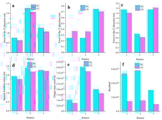 As shown in Figure 7, we compared the BL results of the three sources with the AL results. The teal columns in Figure 7 represent the errors of the BL results, and the pink columns represent the errors of the AL results. The location results include the X, Y, and Z coordinate errors, spatial error, origin time error, and minimum value of the target function. The AL errors of S1 and S2 were larger than the BL errors in the Y direction, and the AL errors of S3 were larger than the BL errors in the Z direction. We calculated the spatial location error using Equation (10):