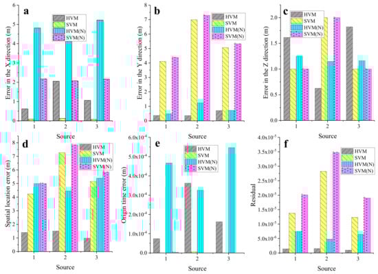 We used these three experiments to compare the errors of the location results of the HVM and SVM in detail, as shown in Figure 8. The origin time error of these four experiments was within 0.6 ms, and the accuracy was very high, which was not used as a criterion. In the case where no noise was added, the location error of the SVM of the three sources in the X direction was smaller than that of the HVM, but the location error of the HVM in the Y direction was smaller than that in the SVM. The location errors of the SVM in the Z direction of S1 and S3 were smaller than those of the HVM, but the opposite was true for S2. Considering the location errors in the X, Y, and Z directions, it was impossible to determine which method had a higher location accuracy. The spatial location error was a comprehensive error in the integrated X, Y, and Z directions. Therefore, the spatial location error calculated using Equation (10) was used as the criterion.