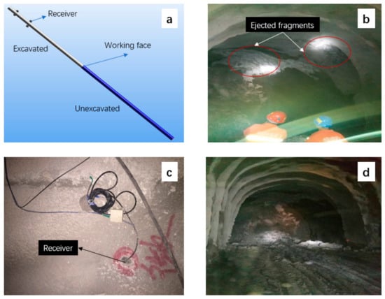Tunnel engineering conditions: (a) receiver layout and progress of tunnel excavation, (b) ejected fragments on the top of the working face, (c) receiver position indicated by red paint, and (d) working face of the project.