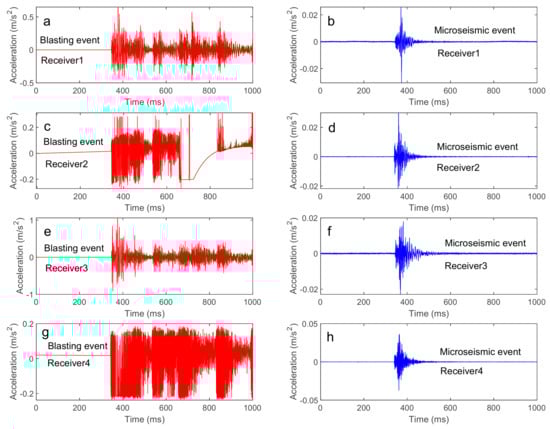 Waveforms of the blasting event and waveforms of the microseismic event: (a,c,e,g) are the waveforms collected by Receiver1, Receiver2, Receiver3, Receiver4 for the blasting event. (b,d,f,h) are the waveforms collected by Receiver1, Receiver2, Receiver3, Receiver4 for the microseismic event.