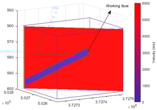 We used the HVM to locate these 51 events. The monitoring area covered the x coordinates from 3,727,271 m to 3,727,516 m, y coordinates from 502,564 m to 502,761 m, and z coordinates from 558 m to 598 m. The block size was 0.5 m × 0.5 m × 0.5 m, so there were a total of 490 × 394 × 80 unit blocks. There are many ways to calculate the propagation velocity of waves in rock masses. For example, Wang et al. optimized the seismic wave velocity in the deep mining area of a coal mine by using a combination method, residual error optimization method, location error optimization method, location residual optimization method, and combined inversion method []. The acquisition of the velocity model was not the focus of this paper. In this application, the wave propagated at a velocity of approximately 6000 m/s in the rock mass. Therefore, we set the velocity of the unexcavated rock mass to 6000 m/s and the velocity of the empty area after excavation to 340 m/s, as shown in Figure 11. The coordinates of the receivers and the arrival time of the seven blasting events are shown in Table 5. The arrival time of the 44 microseismic events is shown in Appendix B.