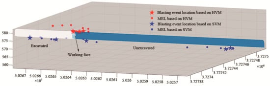 Then, we analyzed the location results of the SVM. As shown in Figure 12, the location results of the blasting events suggested that the SVM results were very scattered. Four of the blasting events were located behind the propulsion direction of the working face, and two blasting events were located approximately 85 m in front of the propulsion direction of the working face. From the location results of the microseismic events, the spatial distribution of the 44 microseismic events was consistent with that of the seven blasting events. The spatial distribution was very scattered, irregular, and not concentrated near the working surface.