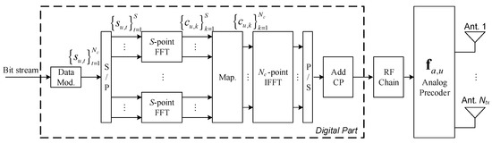 In this section, we describe the proposed transmitter; the receiver design will be discussed in the next section. In Figure 1, we present the block diagram of the uth user terminal. We consider M-QAM constellations, where the data symbols , have The sequence is divided into data blocks of size , where denotes the rth data block, and the sequence is the DFT of a transformation from the time domain to the frequency domain. After the time-frequency transformation the frequency domain data is interleaved and mapped to the OFDM symbols. Finally, the cyclic prefix (CP) is inserted in the blocks associated with each RF chain. Since the proposed hybrid equalizers detect each S-length data block independently, let us focus on a single S-length data block in order to simplify the math formulation [10]. Therefore, hereinafter the index r is not considered and the formulation is done for the frequency domain S-length block , which is the DFT of the time domain sequence .
