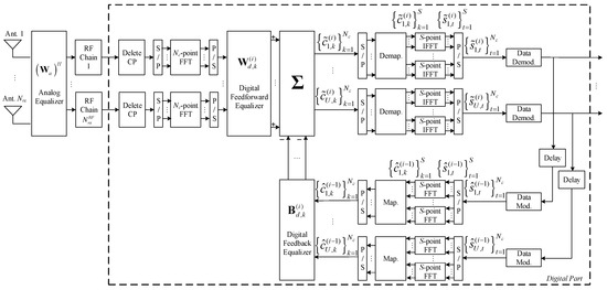 where denotes the analog part of feed-forward matrix for the ith iteration, and and denote the digital part of the feed-forward and feedback matrices, computed at the ith iteration at the kth subcarrier, respectively. The vector , where the block is the FFT of the block of time domain estimates conditioned to the detector output for user u and iteration i. The vector , where is the hard decision associated with the data symbols of user u at iteration i.