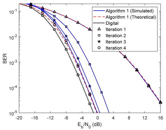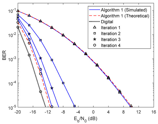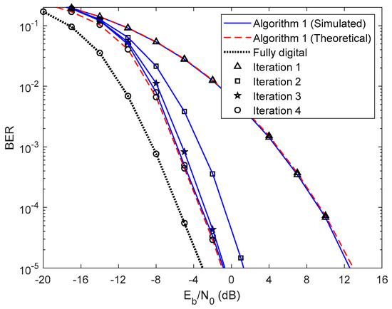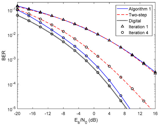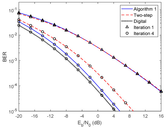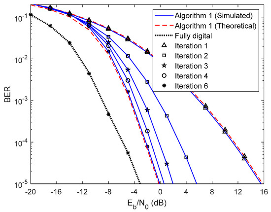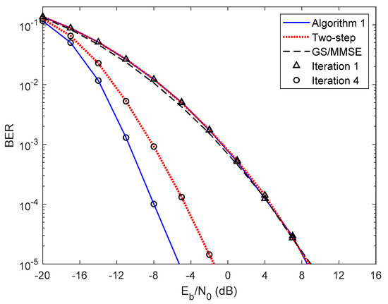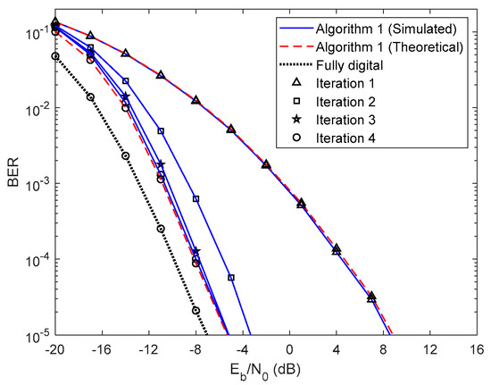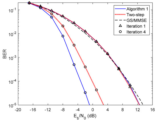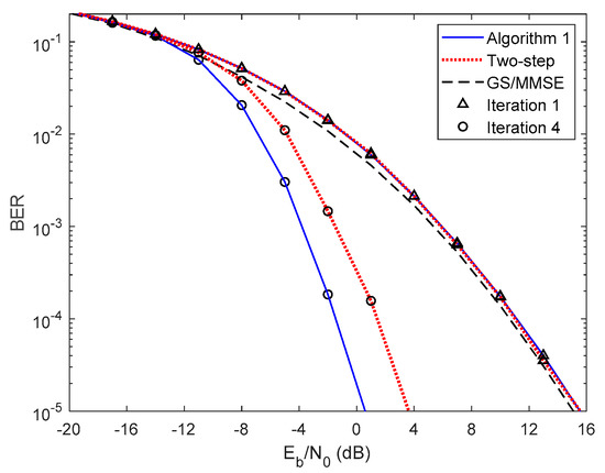In Figure 5 and Figure 6, we compare the performance of the proposed iterative hybrid multi-user equalizer, against the performance of two-step approach proposed in [31], and the scheme proposed in [14], where the analog part is computed by applying the Gram–Schmidt (GS) method, while in the digital part a MMSE equalizer is used, referred here as GS/MMSE approach. Starting by analyzing the first iteration, we can see that the BER performance of the two-step approach and Algorithm 1 are similar, since for iteration 1, both algorithms assume , and then they are equivalent. Focusing now on the fourth iteration, the performance of two-step approach is far from the performance of Algorithm 1. This happens because only the digital part is iteratively, while the proposed algorithm the analog and digital parts are both computed in each iteration, and thus it is more efficient to remove the interferences. From the figure, we can also observe that the performance of the GS/MMSE approach is approximately the same as the one obtained by our schemes for the first iteration.