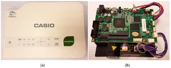 In the construction of 3D SL scanners, commercial, business-class projectors are often used (Figure 1a) [1,5,15,32,33,34,35,36,37]. This is due to their relatively low price, high image quality, and easy integration with other scanner components. Business projectors are usually equipped with an HDMI, DisplayPort, or VGA input, which allows for their easy integration with a computer and scanner control software. The drawback of using commercial business projectors is the fact that their design has not been optimized for use in 3D scanners [8,15]. Consequently, their lenses and the optical path are often not rigid enough. Some projectors have a cooling system that vibrates the optical system. These vibrations do not affect the perception of the image when using the projector for standard usage but, when using the projector as a source of projected images in a 3D scanner, such vibrations are unacceptable. Another disadvantage is additional hardware improvements which, in 3D scanners, may lead to deterioration of the quality of scans or scanner de-calibration. These are all kinds of image correction functions (e.g., keystone correction or resolution interpolation), as well as functions related to the adaptive change in image intensity depending on external light. These types of functions can affect the intensity, contrast, and linearity of projected images. An additional feature, which is not always desired in the projectors used in 3D scanners, is the fact that color images are displayed. In 3D SL scanners, raster images are most often monochrome [2,3,8,38,39,40]. The use of all three projection channels may cause deterioration of the quality of the designed rasters, due to the chromatic aberrations between the R, G, and B channels. For this reason, often, only one color channel is used to project fringe images.