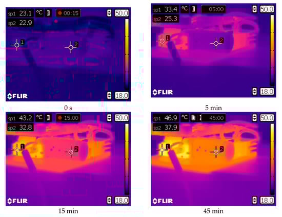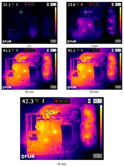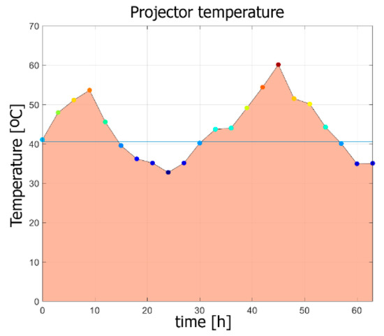 In Figure 5, the warming-up process of the projector DLP Casio XJ-A252, registered by the thermal camera Flir E40, is shown. The experiment lasted about 50 min. One measurement point was defined, placed near the optical system. For this experiment, the top plate of the projector housing was removed.