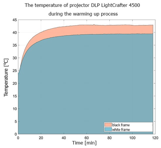 The conducted experiments show that the heat distribution on the surface of the projectors was not uniform. The LightCrafter 4500 reached its thermal equilibrium about 50–55 min after power-up, while that for the Casio XL-A252 projector was after about 20 min. The difference in the registered temperature while displaying black and white frames was caused by the fact that, during the projection of the white frame, all micro-mirrors from the DMD sensors reflected light to the projection lens but, during the black frame projection, all micro-mirrors reflected light to the absorber. For the DLP LightCrafter 4500, the difference in temperature during the projection of black and white frames reached up to 5–6 . In the Casio projector, the difference was not as significant, about 1 (Figure 6). This difference in projector behavior was caused by the adaptive cooling system implemented in the Casio XJ-A252 projector.