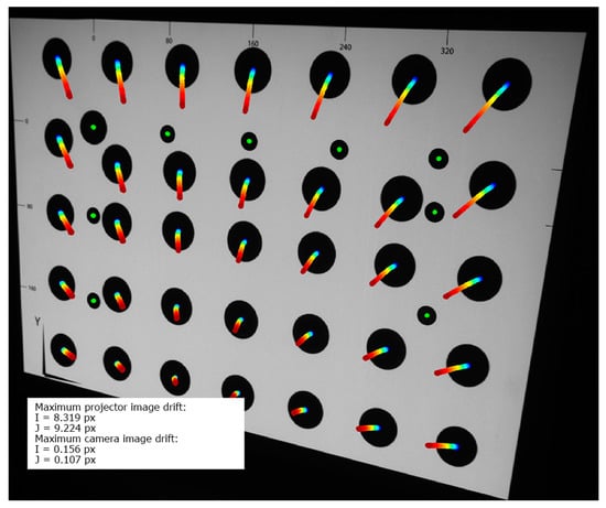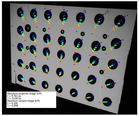 In Figure 7, the thermal image drift caused by the warming-up process of the LightCrafter4500 projector is shown. The first registered frame is the background of this figure (it was captured immediately after the projector was turned on at the beginning of the warming-up process). There are two types of markers visible: thirty-five large black markers (marked with their trajectories), which were projected by the projector, and nine smaller black markers (marked with bright green color), which were printed on the validation artefact. In order to obtain the trajectory of projected markers, their coordinates are extracted from each captured frame and marked on the background image with the colored indicator (the color denotes the temperature of the projector). The shift of each marker canter is multiplied 20 times. The image drift presented Figure 7 shows that the projected image had shrunk around the center-bottom point of the image. The maximum drift of the projected markers was equal to 8.319 px horizontal and 9.224 vertical, which is equal to 1.89 mm horizontal shift and 2.1 mm vertical shift in the artefact plane. The markers printed on the validation artefact remained stable during the whole experiment. Its maximum drift was no higher than 0.156 px, which means that the positioning between the external camera and the validation artefact remained stable during the whole experiment and that image drift and deformation were caused only due to thermal effects in the projector.