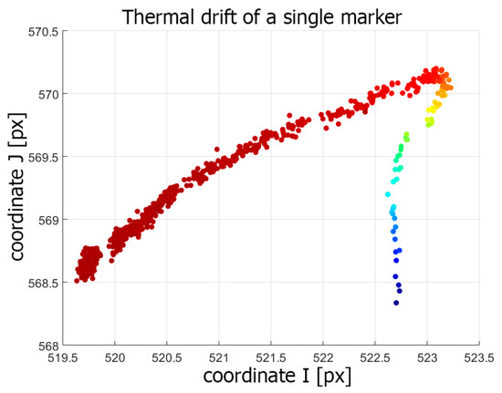 In Figure 8, the thermal image drift of the Casio XJ-A252 projector is presented. All markings and the test method were the same as for the LightCrafter 4500 warming-up experiment. The maximum drift of the projected markers was equal to 4.334 px horizontal and 2.065 vertical, which is equal to 1.05 mm horizontal shift and 0.51 mm vertical shift in the artefact plane. The markers printed on the validation artefact remained stable during the whole experiment, with maximum drift no higher than 0.203 px. All marker trajectories were similar. In Figure 9, the trajectory of a single marker is shown. In the first stage of the warming-up process, a global shift in the vertical direction can be observed. After a while of warming-up (at around 37 ), the trajectories turned to the left. This type of temperature drift was most likely due to the uneven heating of the projector. During the initial warming-up phase, the nature of the thermal drift was caused by some particular part of the projector. When the heat generated by the projector began to flow to other parts of the projector, they also began to deform, and the nature of the drift changed. Another conclusion from the analysis of Figure 9 is that the drift progressed, even though the projector temperature did not change. The reason for this phenomenon was the heterogeneous temperature distribution on the projector’s surface and that the external temperature sensor was located in a place where the projector locally reached its thermodynamic equilibrium much faster. However, this state was not the same as the state of thermodynamic equilibrium of the entire projector. Thus, in the approach to building a compensation model for this projector model, one should choose a different place to measure the temperature.