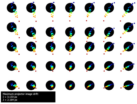 Figure 11 presents the registered thermal drift of the projected images. The maximum drift of the projected markers was equal to: horizontal and vertical, equal to horizontal shift and vertical shift in the artefact plane. The markers printed on the validation artefact remained stable during the whole experiment, with maximum drift no higher than . The image thermal drifts presented in Figure 7, Figure 8 and Figure 11 are presented in the coordinates of the external camera. Therefore, the coordinates had to be transformed into the coordinates relative to the displayed image (i.e., the projector coordinates). Polynomial fitting was used to approximate the functions that describe the relationship between projector and camera coordinates. Figure 12 shows the image thermal drift recorded during the experiment, in the coordinates related to the displayed image. The background of the image is the bitmap displayed by the projector, and subsequent shifts of the marker centers are marked with colors (the shifts were scaled 20×). The maximum values of the thermal drift of the image were horizontal and vertical.
