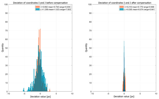 The best fitting results were observed when using a th degree polynomial. Figure 13 shows histograms presenting the values of the coordinates of the projector markers at different temperatures relative to the coordinates at the reference temperature before and after compensation. The presented histograms show that, after application of the compensation model, the projector marker coordinate deviations decreased significantly. The mean absolute value before compensation was equal to and and those after compensation decreased to and . The thermal image drift range before compensation was and and that after compensation was and . The reduction in the deviation of projector marker coordinates confirmed that the calculated compensation model allowed for a reduction in image deformation caused by changes in the external temperature of the projector.