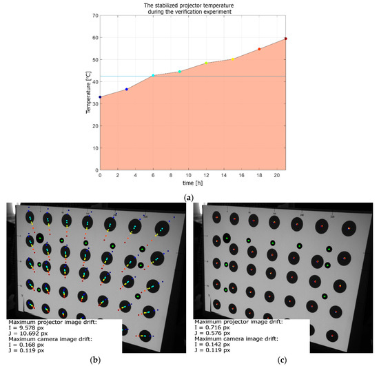 The transformed images were calculated for the entire temperature range of the projector, from to with a step of . This resulted in a set of 271 images for the entire temperature range. Another set of images, projected by the projector in varying ambient temperature (Figure 14a), was collected. At each stabilized temperature, two kinds of frames were captured by the external camera: one frame with the projector displaying the original (undeformed) bitmap and another frame with the bitmap transformed by the imwarp function with respect to the corresponding projector temperature. Figure 14b presents the trajectories of the markers calculated for projection using the undeformed (uncompensated) bitmap. The maximum image drift was equal to horizontal and vertical. Figure 14c presents the trajectories of the markers calculated for the projection using the deformed (compensated) bitmaps. The maximum image drift was equal to horizontal and . The positions of the markers printed on the artefact remained the same during the whole experiment (maximum shift was no higher than ).