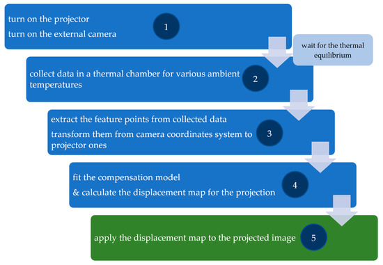 The whole process of compensation is presented in Figure 15. The process starts after the projector and camera reaches its thermal equilibrium. Then the compensation data needs to be collected: the set of images with the pattern described in Section 3.2 (Figure 2d) in various ambient temperatures (Figure 10). The next thing is to extract the feature points (centers of projected markers) from collected data (Figure 11) and transform them into the projector coordinates system (Figure 1 and Figure 12). Then the compensation model can be calculated, and the displacement map for a particular temperature (from the temperature range determined in stage 2, Figure 15) can be estimated. The last thing to do is to apply the displacement map to the projected image in the corresponding ambient temperature.